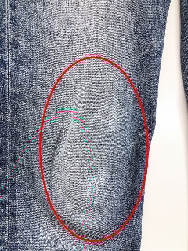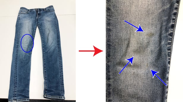 このジーンズは、家庭用洗剤で2回付け置き洗いをした後のものです。