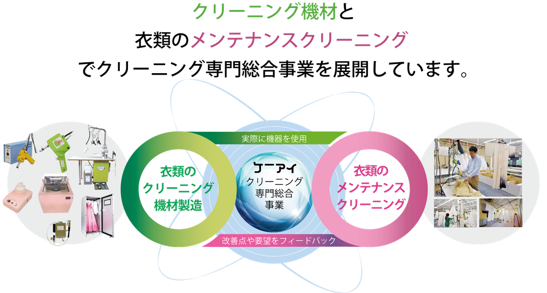 弊社は創業40年以上にわたり、衣類のクリーニング機器の製造とクリーニングサービスを展開するクリーニング専門総合事業を営んでおります。自社で製造した機器をクリーニング部門で使用し、そこで得た改善点や要望を製造部門にフィードバックすることで、技術とサービスの両面から総合的な事業を展開しています。