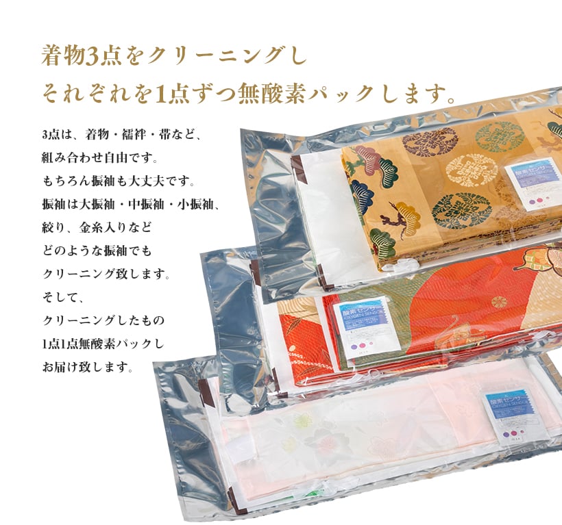 3点は、着物・襦袢・帯など、組み合わせ自由です。もちろん振袖も大丈夫です。